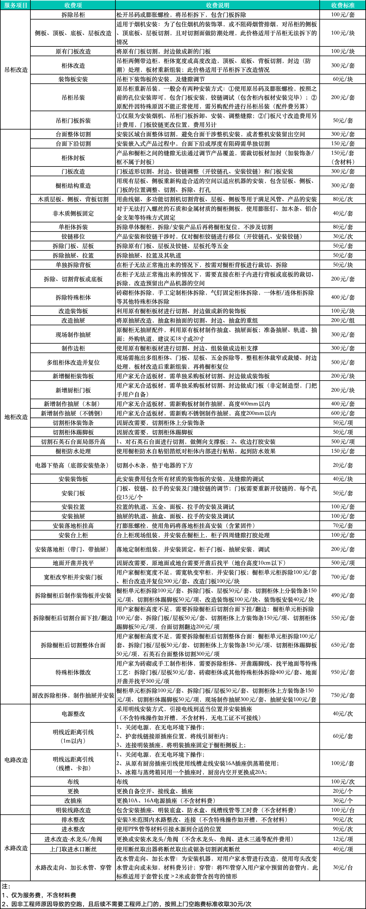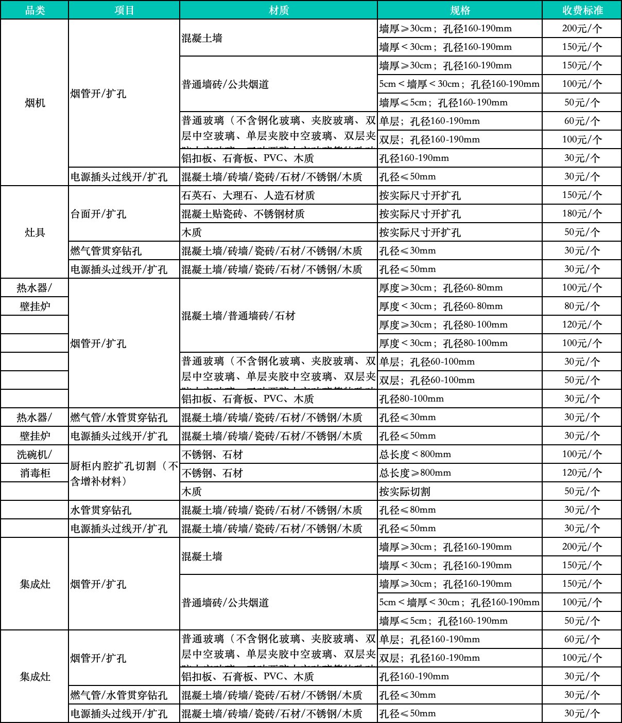 五、廚衛(wèi)電器安裝開孔擴孔服務收費標準